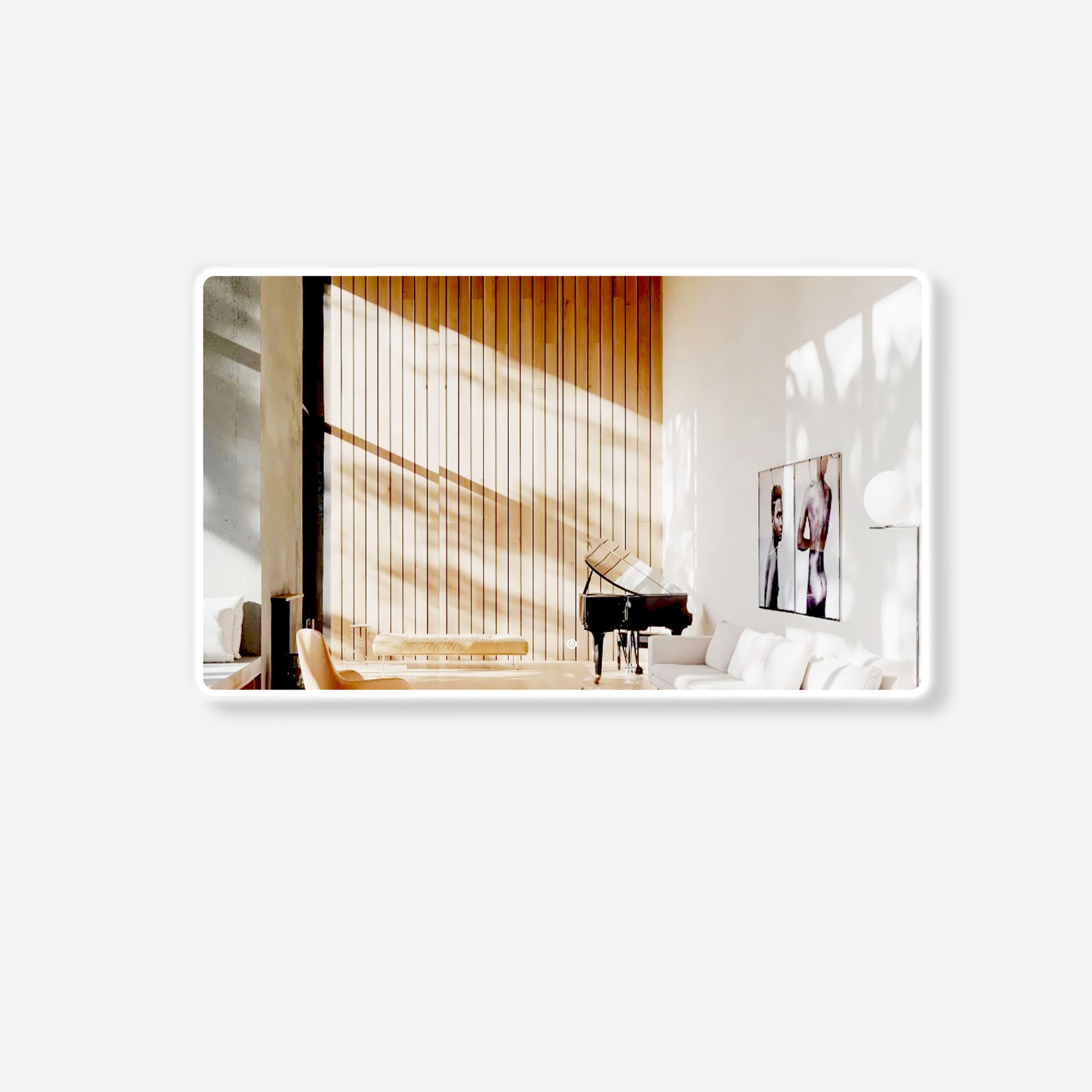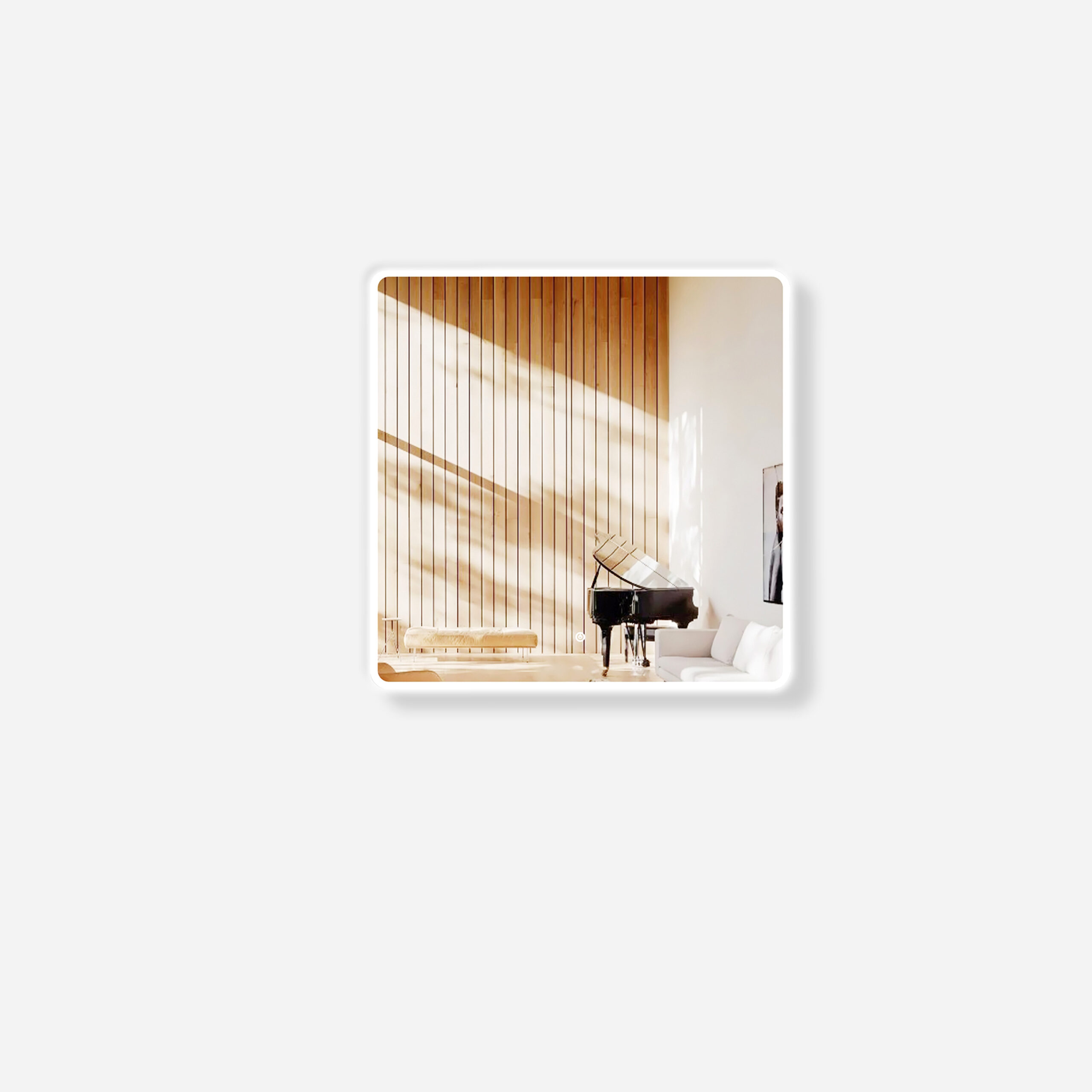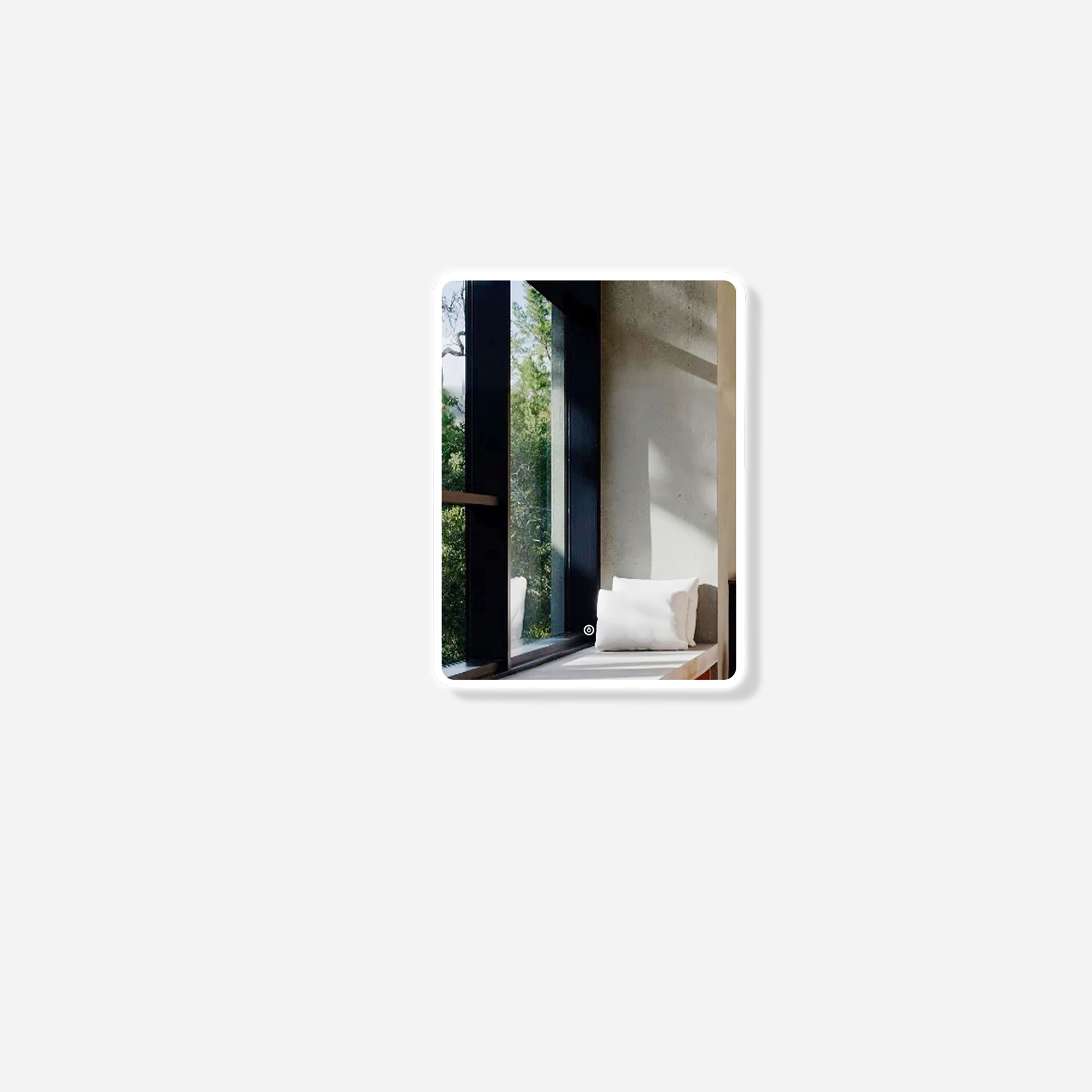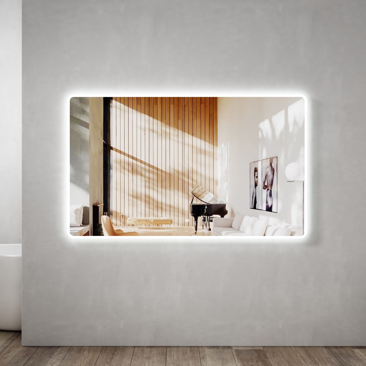 Beautifully styled frameless wall mirror having LED lighting radiating from behind the rectangle-shaped wall mirror. The backlit wall mirror creates its own border for an appealing feel. Your bathroom is ensured to be well illuminated as the mirror itself adds to the brightness.